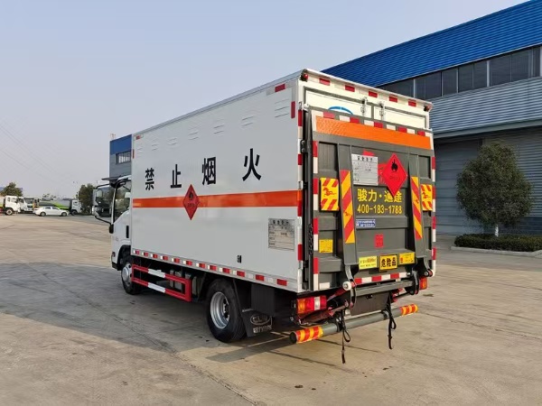 貨箱配置 廂體為雙層金屬骨架結構,外板采用冷軋鋼板,中間填充阻燃泡沫,內飾為鋁板。底板為平板上鋪防靜電膠皮。廂內兩側加裝固定貨物臥環,門框帶防盜報警器,頂部帶煙霧報警器,廂體右側選裝側門,隨車配2個滅火器,危險標志牌,防火帽,危險品三角頂燈。(選裝瓦楞板貨箱) (尾部可選裝液壓升降尾板)