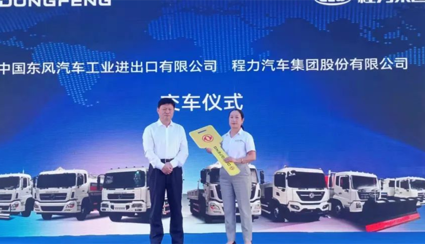 隨后,中國(guó)東風(fēng)汽車工業(yè)進(jìn)出口有限公司商用車海外營(yíng)銷部中重型產(chǎn)品總監(jiān)吳永剛與程力集團(tuán)國(guó)際市場(chǎng)部業(yè)務(wù)經(jīng)理陳葦舉行了交車鎖匙牌授牌儀式。
