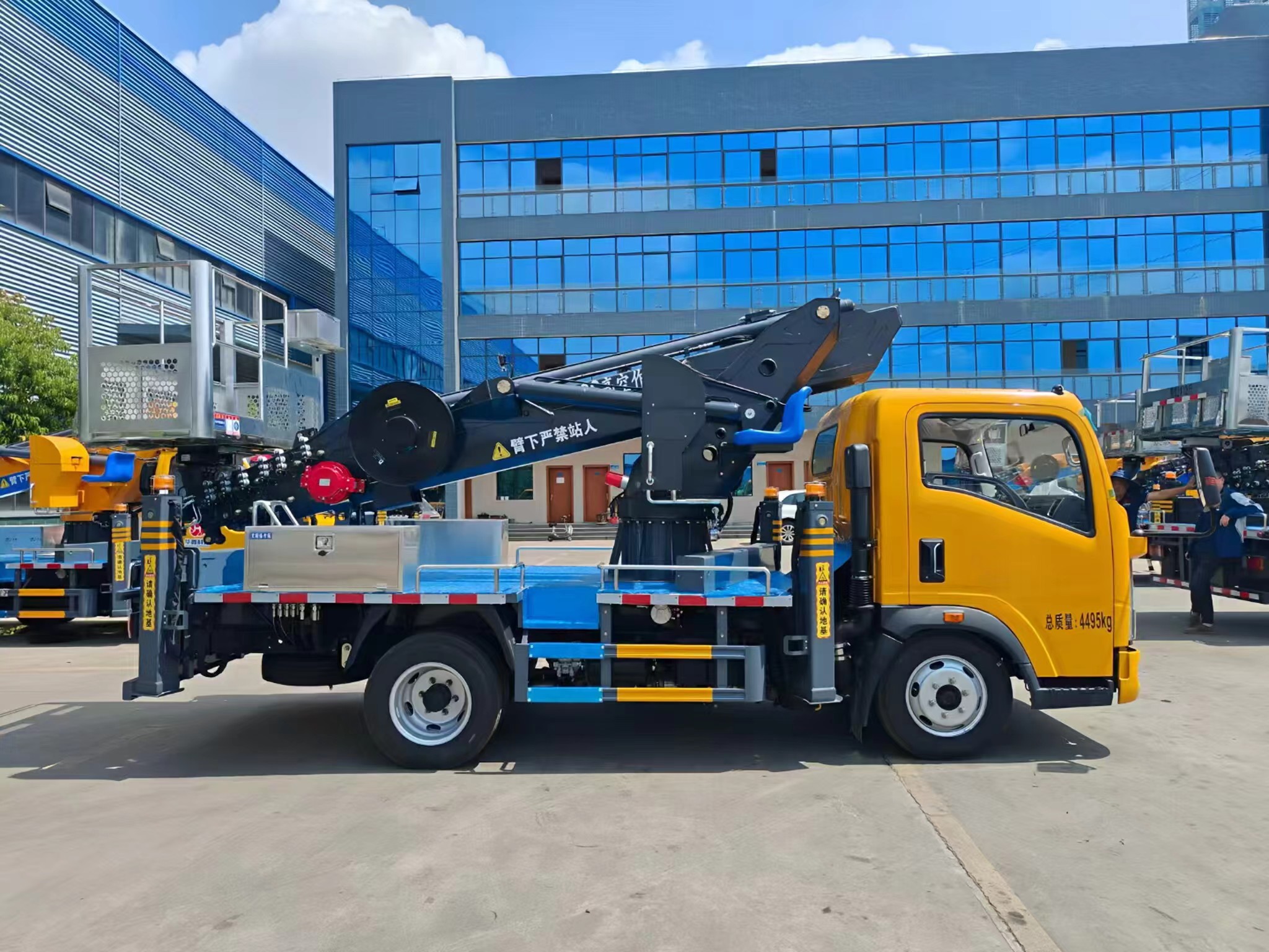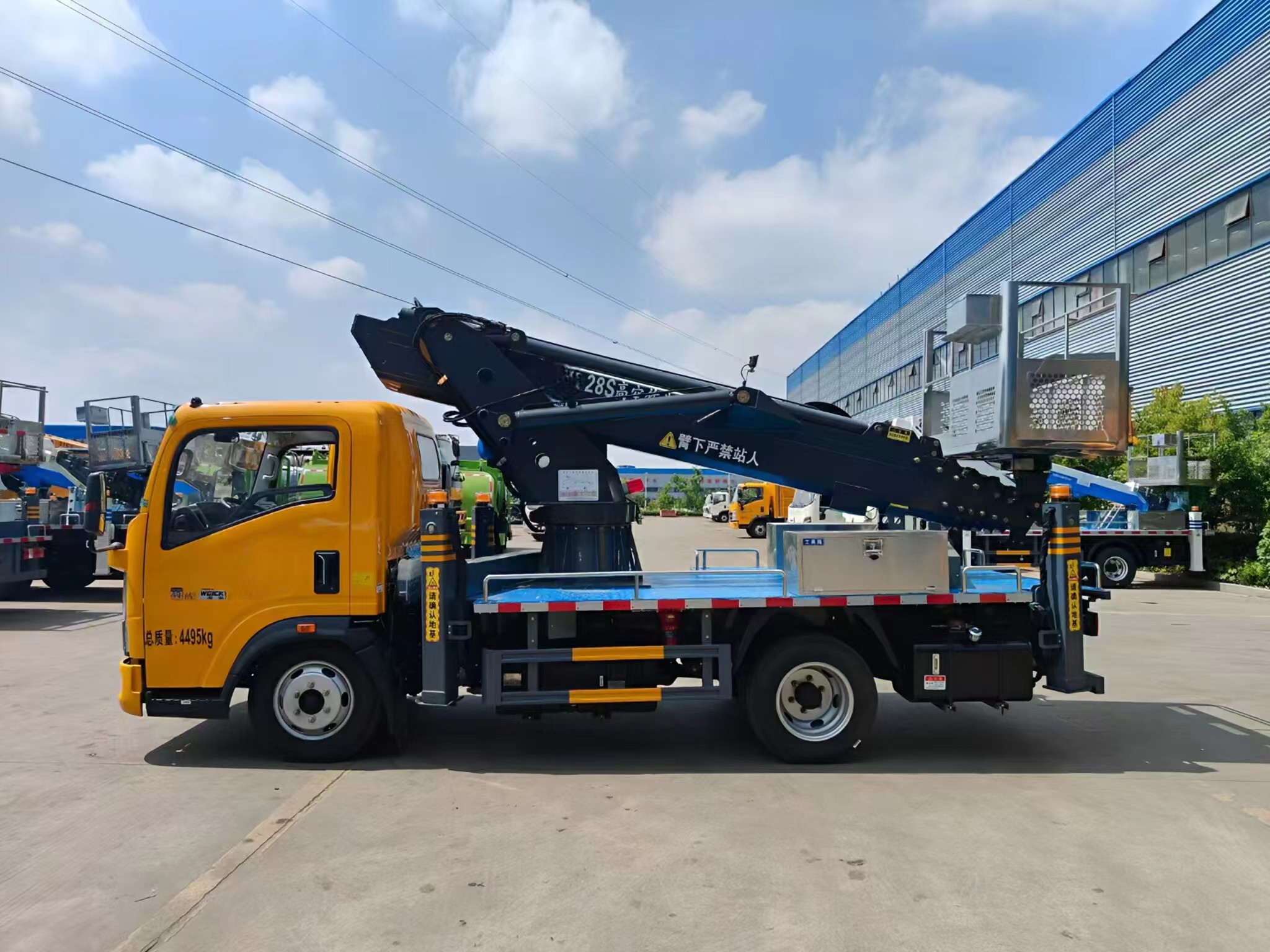 上裝配置 高空作業車基本功能安全配置: 最大作業高度23米,28米,31米 工作平臺: 高強度不銹鋼尺寸:1600*700*1000mm;360度連續回轉,電控操作,另配有手動應急操作; 控制系統:CAN總線控制系統,配有無線遙控器、實現無級調速, 調平系統:靜液自動調平 臂架形式:★多邊形型工作臂,同步伸縮 支腿:★前V后H型/前V后V單獨可調(控制)